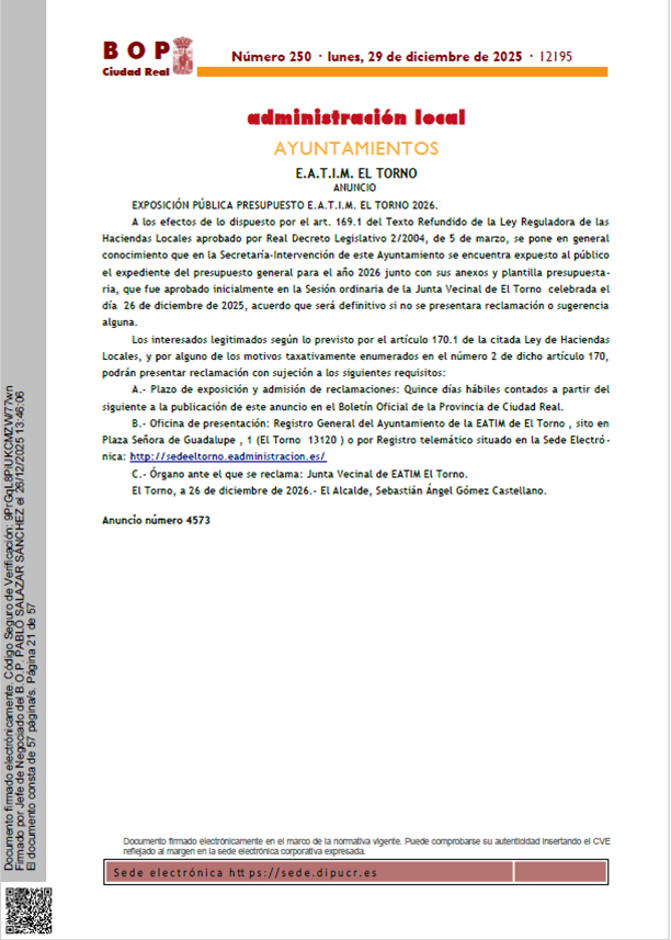 Exposición pública presupuesto E.A.T.I.M. El Torno 2026.