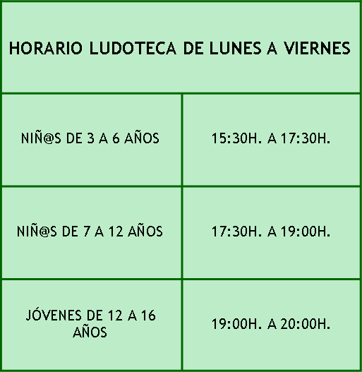 La Ludoteca ofrece un servicio de lunes a viernes dirigido a niños y jóvenes. Es un espacio donde los más pequeños juegan y aprenden con las actividades programadas por la monitora. Además, cuentan con una sala donde los más mayores pueden realizar sus deberes con la ayuda y supervisión de una monitora.